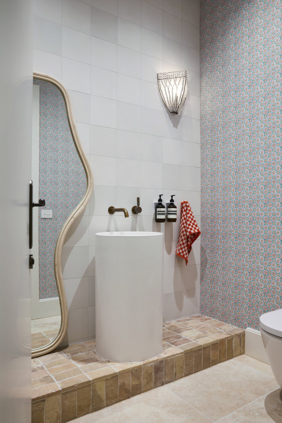 « Dans la salle d’eau, nous avons utilisé des carreaux de terre cuite Gather Co et des carreaux de sol en travertin de Tiles of Ezra », explique Kerri. Le papier peint « Flora » est d’Anna Spiro.Crédit:Armelle Habib