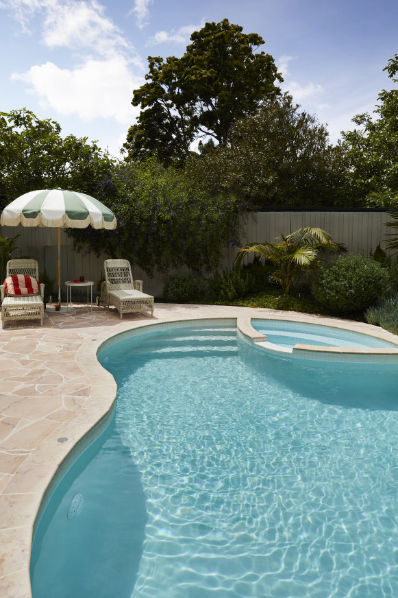 « J’ai presque choisi des pavés beiges pour la piscine, puis je suis tombé sur cette dalle de « pavage fou » en calcaire rose de Gather Co », explique Kerri. Le parapluie est de Basil Bangs.Crédit:Armelle Habib
